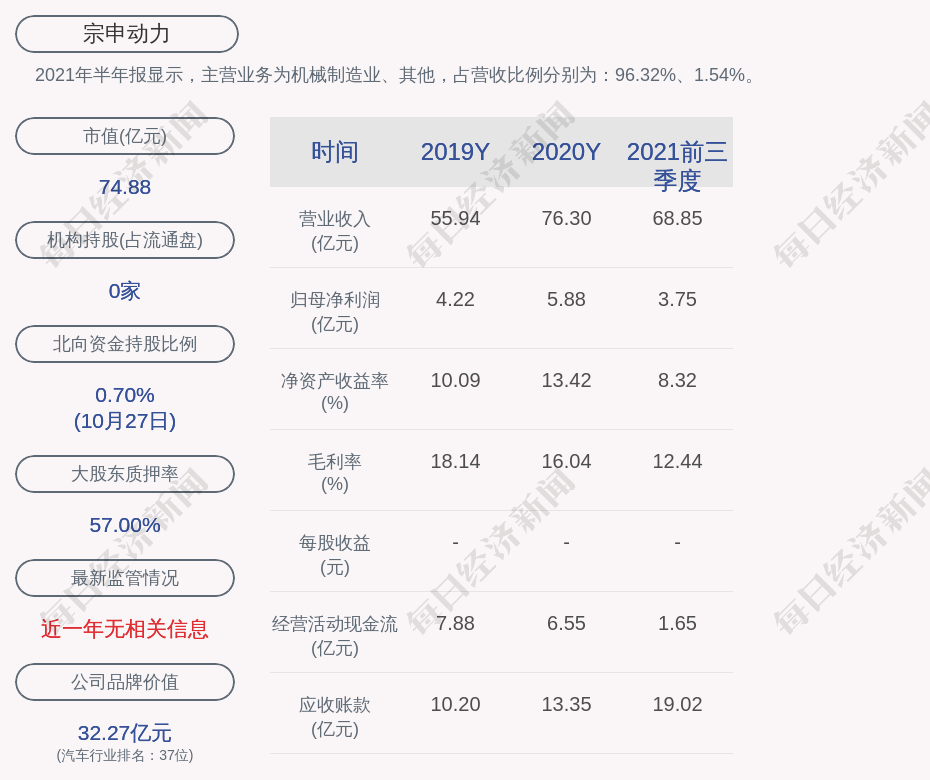 2021年半年报显示,宗申动力的主营业务为机械制造业、其他,占营收比例分别为:96.32%、1.54%。