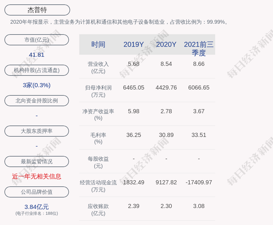 2020年年报显示,杰普特的主营业务为计算机和通信和其他电子设备制造业,占营收比例为:99.99%。