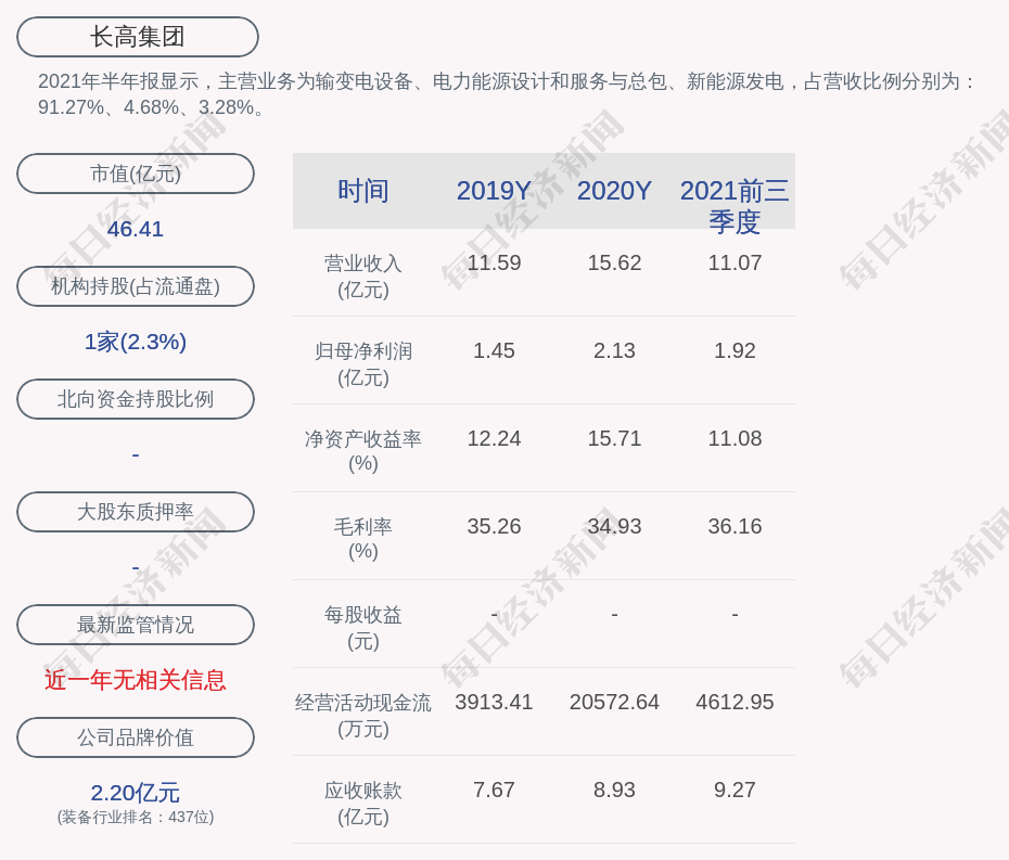 2021年半年报显示,长高集团的主营业务为输变电设备、电力能源设计和服务与总包、新能源发电,占营收比例分别为:91.27%、4.68%、3.28%。