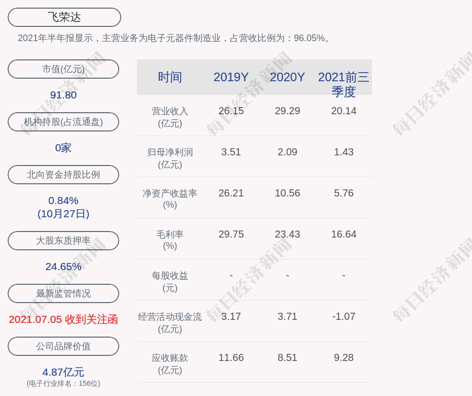 2021年半年报显示,飞荣达的主营业务为电子元器件制造业,占营收比例为:96.05%。