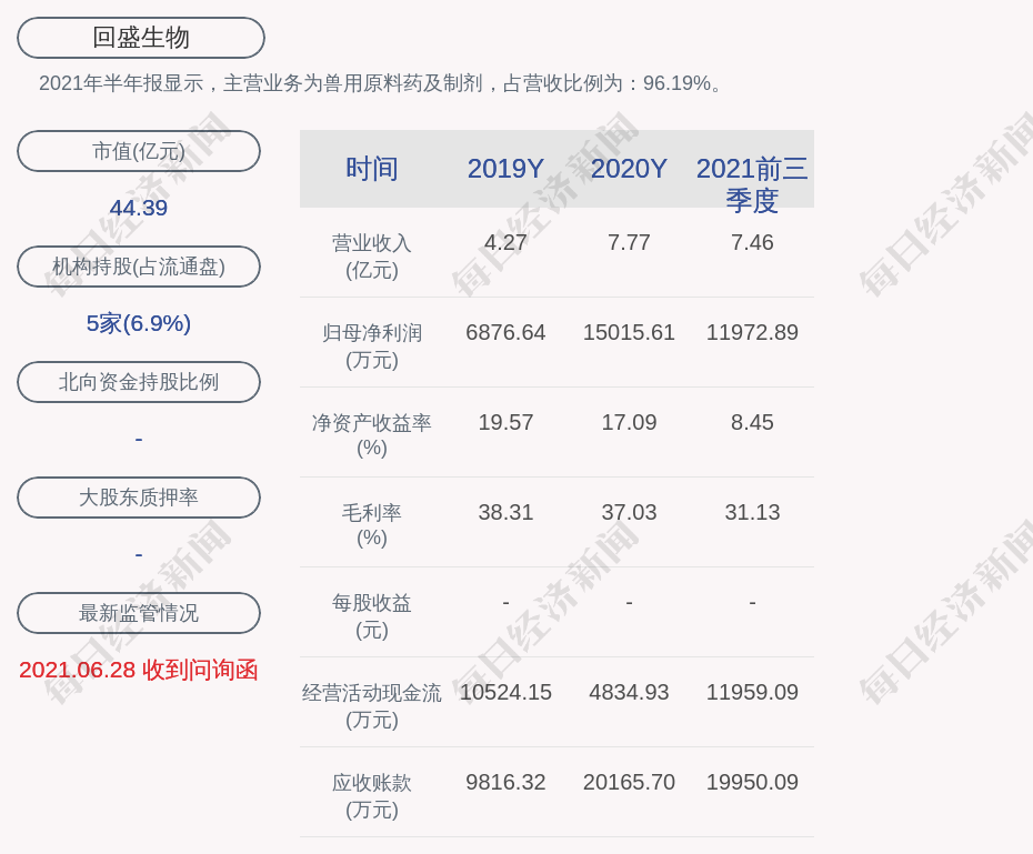 2021年半年报显示,回盛生物的主营业务为兽用原料药及制剂,占营收比例为:96.19%。