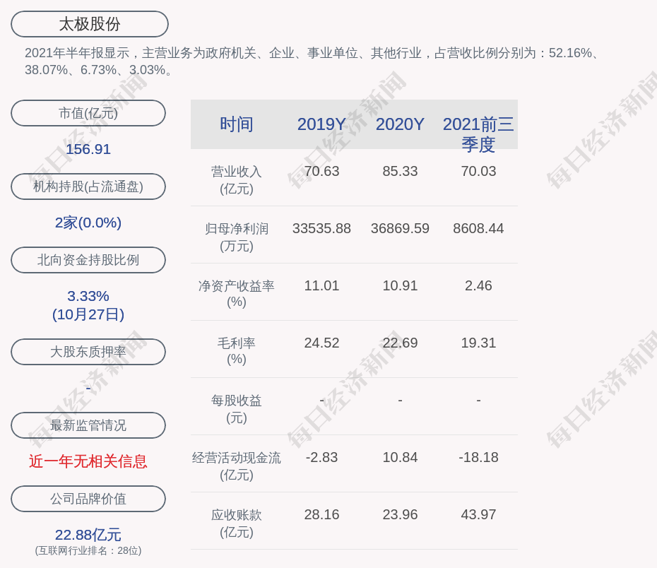 2021年半年报显示,太极股份的主营业务为政府机关、企业、事业单位、其他行业,占营收比例分别为:52.16%、38.07%、6.73%、3.03%。