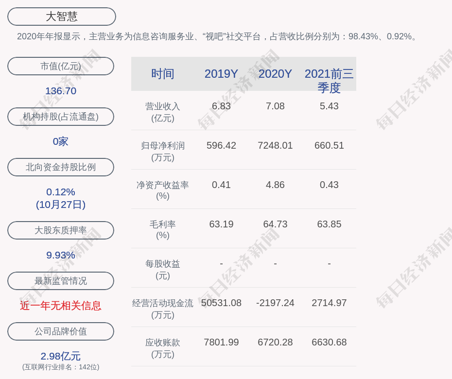 2020年年报显示,大智慧的主营业务为信息咨询服务业、“视吧”社交平台,占营收比例分别为:98.43%、0.92%。