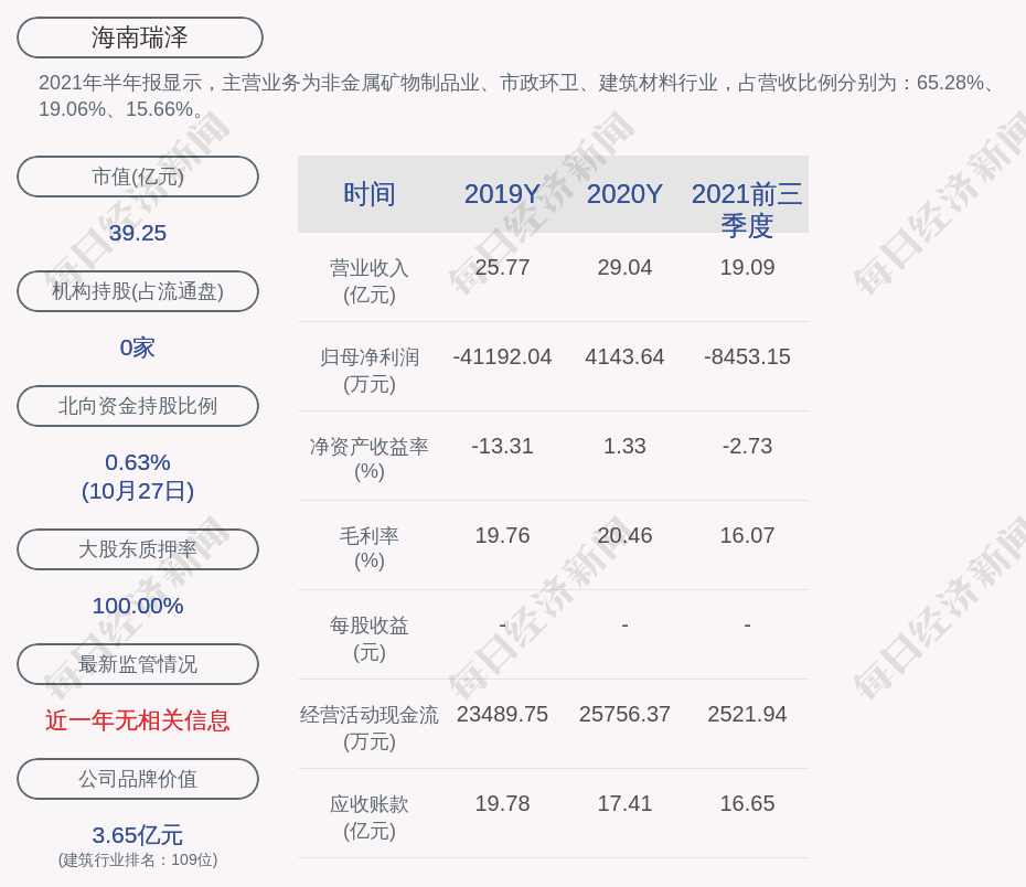 2021年半年报显示,海南瑞泽的主营业务为非金属矿物制品业、市政环卫、建筑材料行业,占营收比例分别为:65.28%、19.06%、15.66%。
