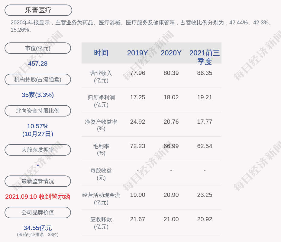 2020年年报显示,乐普医疗的主营业务为药品、医疗器械、医疗服务及健康管理,占营收比例分别为:42.44%、42.3%、15.26%。