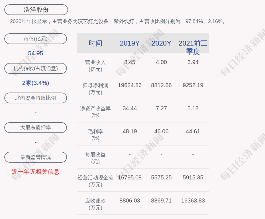 2020年年报显示,浩洋股份的主营业务为演艺灯光设备、紫外线灯,占营收比例分别为:97.84%、2.16%。
