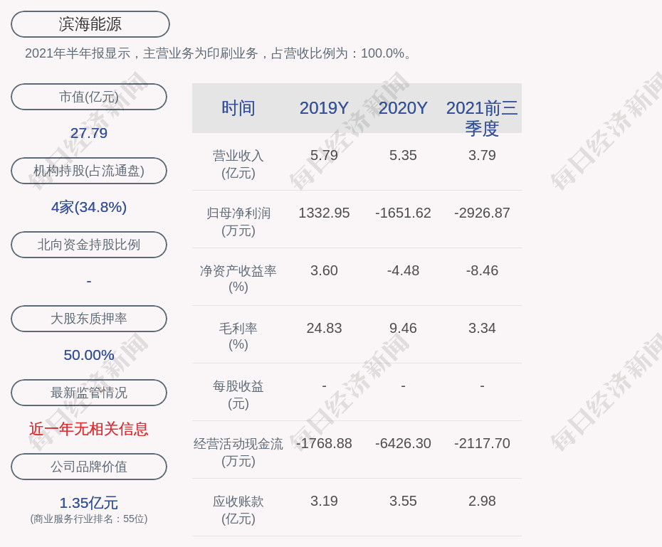2021年半年报显示,滨海能源的主营业务为印刷业务,占营收比例为:100.0%。