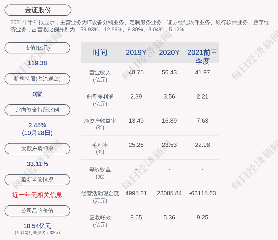 2021年半年报显示,金证股份的主营业务为IT设备分销业务、定制服务业务、证券经纪软件业务、银行软件业务、数字经济业务,占营收比例分别为:59.93%、12.89%、9.38%、8.04%、5.12%。