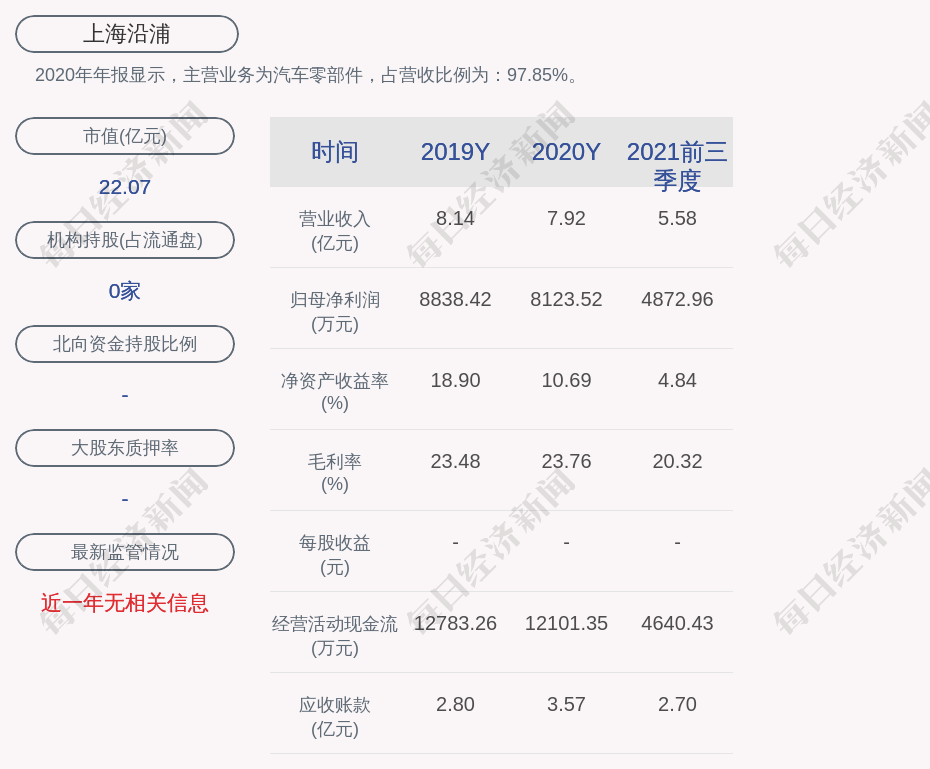 2020年年报显示,上海沿浦的主营业务为汽车零部件,占营收比例为:97.85%。
