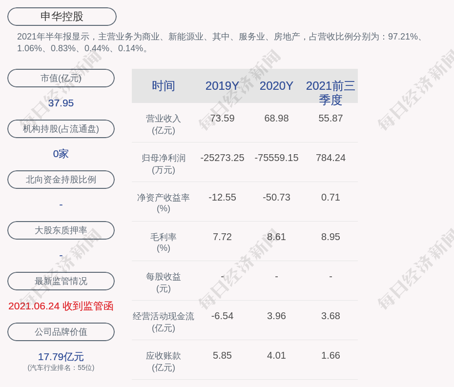 2021年半年报显示,申华控股的主营业务为商业、新能源业、其中、服务业、房地产,占营收比例分别为:97.21%、1.06%、0.83%、0.44%、0.14%。