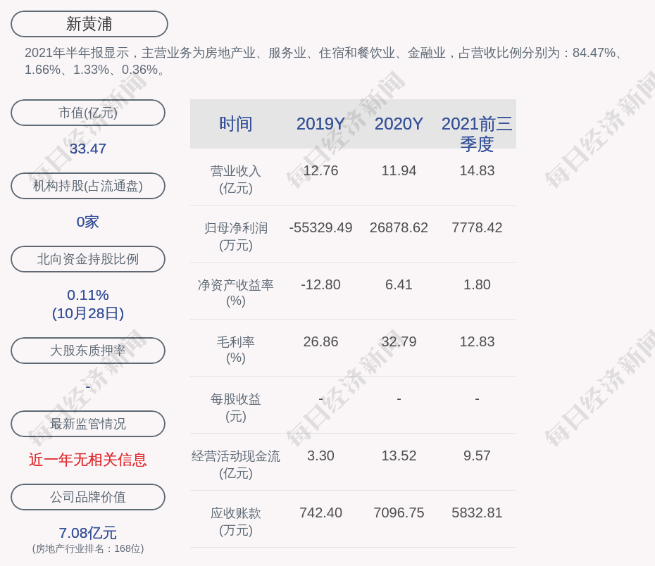 2021年半年报显示,新黄浦的主营业务为房地产业、服务业、住宿和餐饮业、金融业,占营收比例分别为:84.47%、1.66%、1.33%、0.36%。