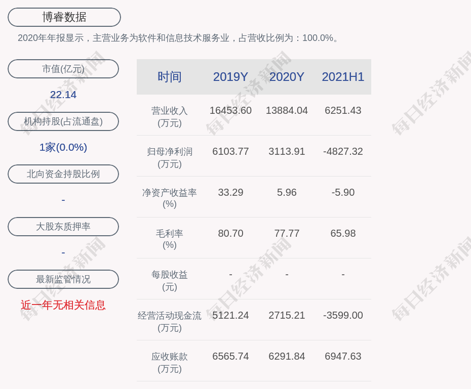 2020年年报显示,博睿数据的主营业务为软件和信息技术服务业,占营收比例为:100.0%。