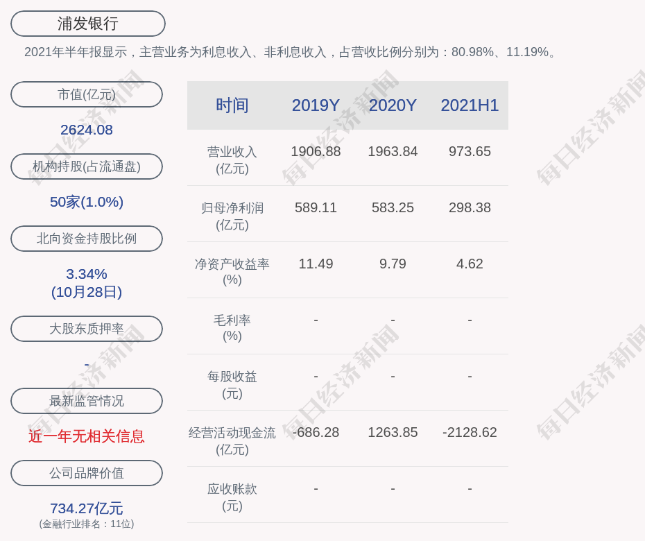 2021年半年报显示,浦发银行的主营业务为利息收入、非利息收入,占营收比例分别为:80.98%、11.19%。