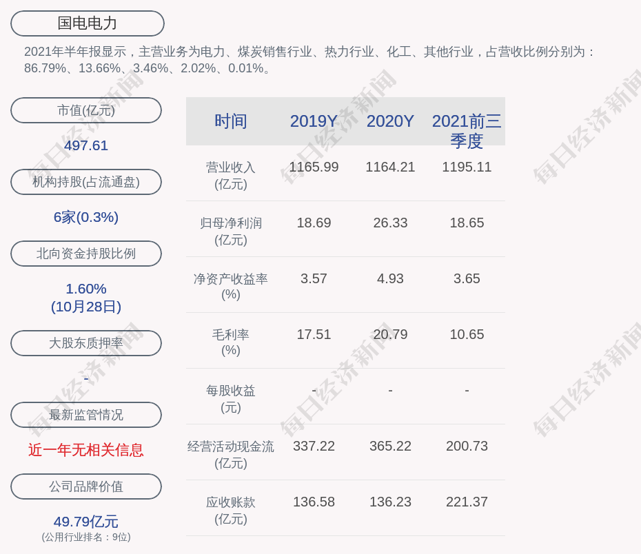 2021年半年报显示,国电电力的主营业务为电力、煤炭销售行业、热力行业、化工、其他行业,占营收比例分别为:86.79%、13.66%、3.46%、2.02%、0.01%。
