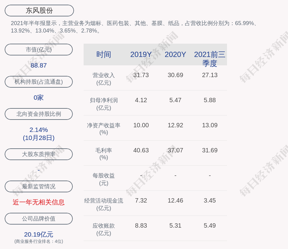 2021年半年报显示,东风股份的主营业务为烟标、医药包装、其他、基膜、纸品,占营收比例分别为:65.99%、13.92%、13.04%、3.65%、2.78%。