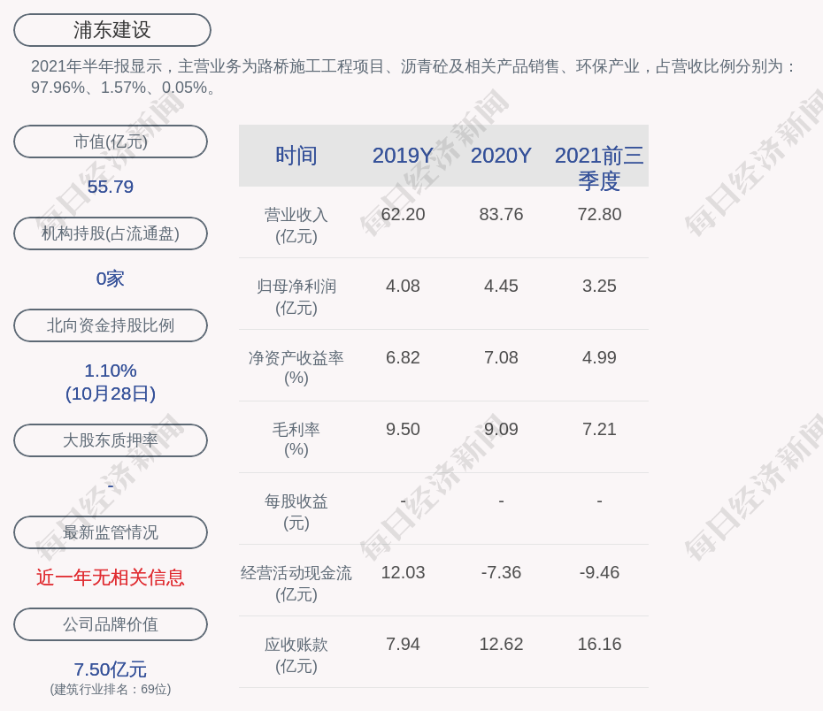 2021年半年报显示,浦东建设的主营业务为路桥施工工程项目、沥青砼及相关产品销售、环保产业,占营收比例分别为:97.96%、1.57%、0.05%。