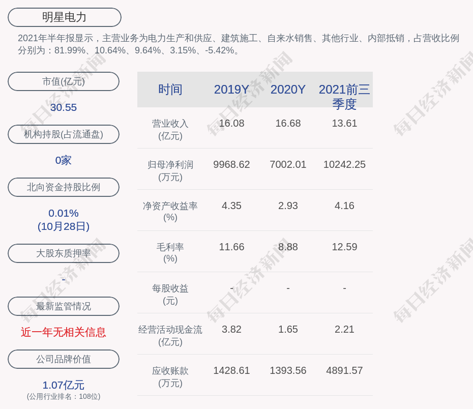 2021年半年报显示,明星电力的主营业务为电力生产和供应、建筑施工、自来水销售、其他行业、内部抵销,占营收比例分别为:81.99%、10.64%、9.64%、3.15%、-5.42%。