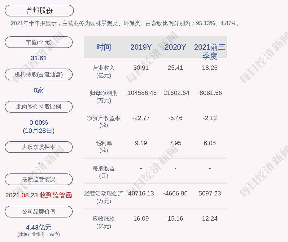 2021年半年报显示,普邦股份的主营业务为园林景观类、环保类,占营收比例分别为:95.13%、4.87%。