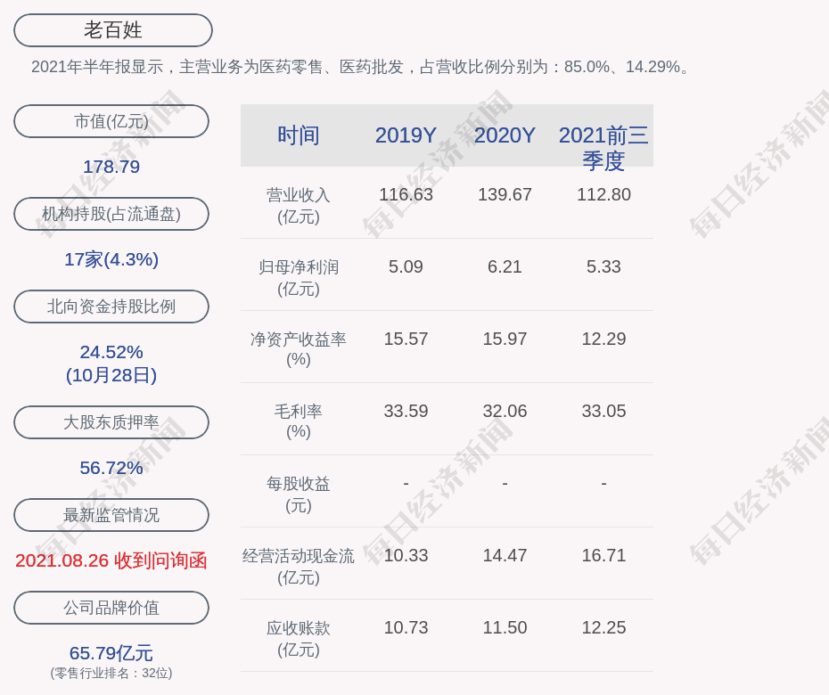 2021年半年报显示,老百姓的主营业务为医药零售、医药批发,占营收比例分别为:85.0%、14.29%。