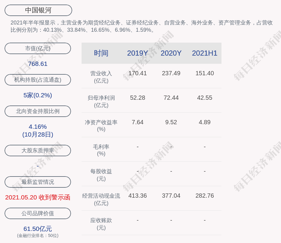 2021年半年报显示,中国银河的主营业务为期货经纪业务、证券经纪业务、自营业务、海外业务、资产管理业务,占营收比例分别为:40.13%、33.84%、16.65%、6.96%、1.59%。