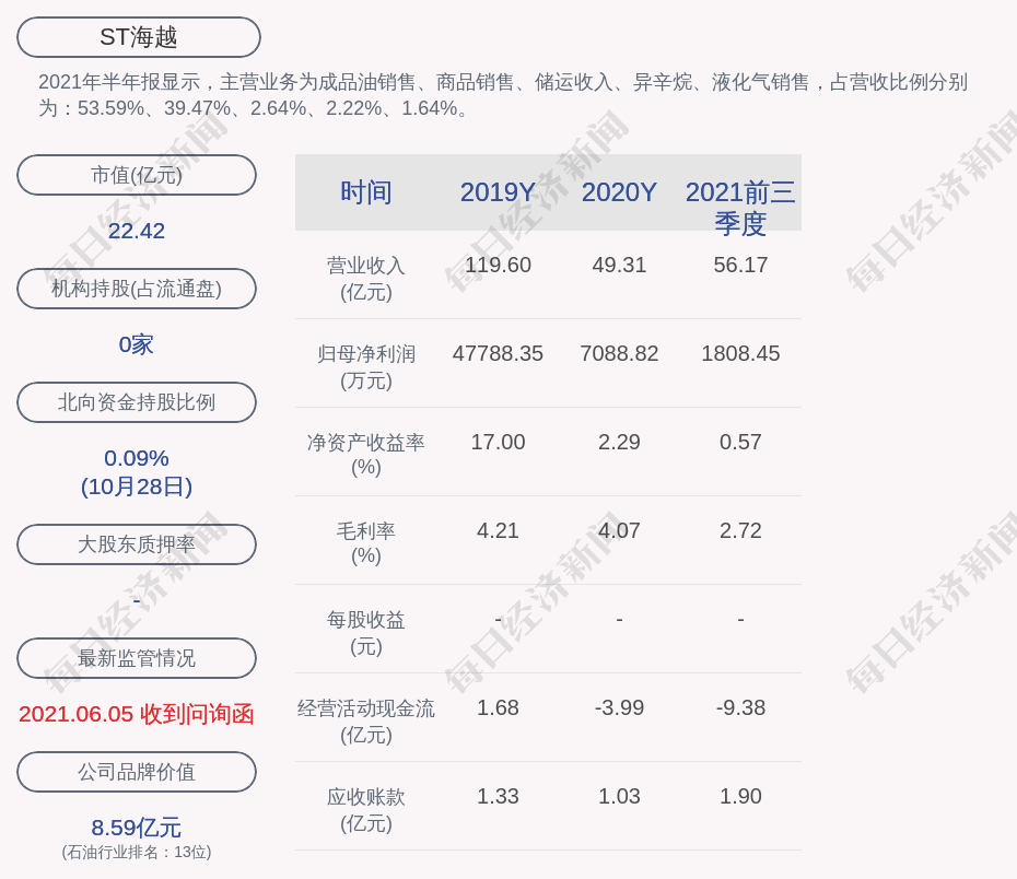 2021年半年报显示,ST海越的主营业务为成品油销售、商品销售、储运收入、异辛烷、液化气销售,占营收比例分别为:53.59%、39.47%、2.64%、2.22%、1.64%。
