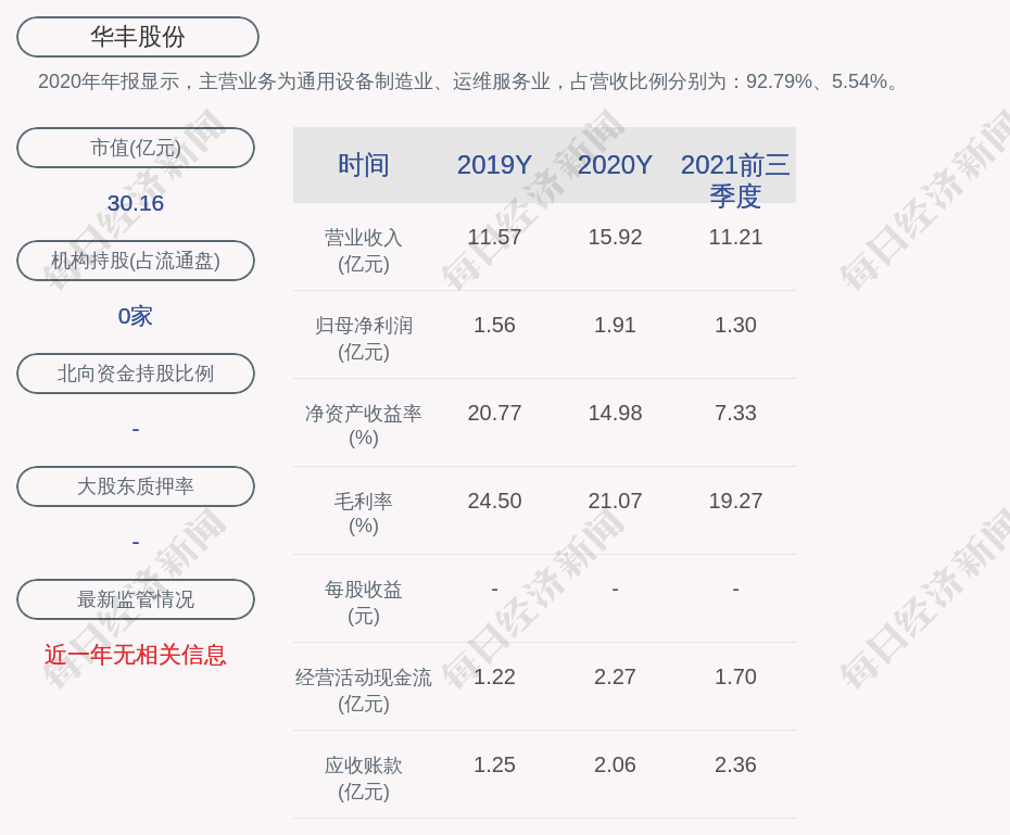 2020年年报显示,华丰股份的主营业务为通用设备制造业、运维服务业,占营收比例分别为:92.79%、5.54%。