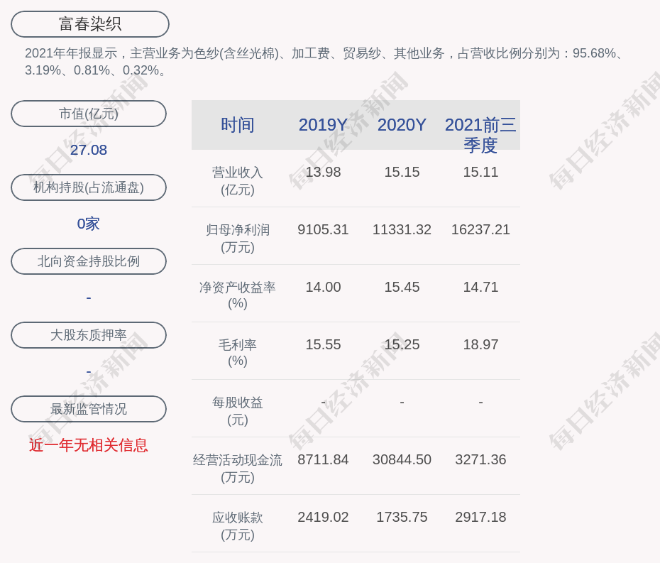 2021年年报显示,富春染织的主营业务为色纱(含丝光棉)、加工费、贸易纱、其他业务,占营收比例分别为:95.68%、3.19%、0.81%、0.32%。
