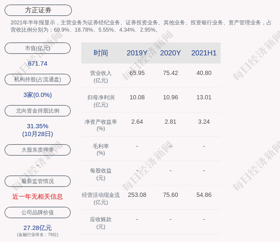 2021年半年报显示,方正证券的主营业务为证券经纪业务、证券投资业务、其他业务、投资银行业务、资产管理业务,占营收比例分别为:69.9%、18.78%、5.55%、4.34%、2.95%。
