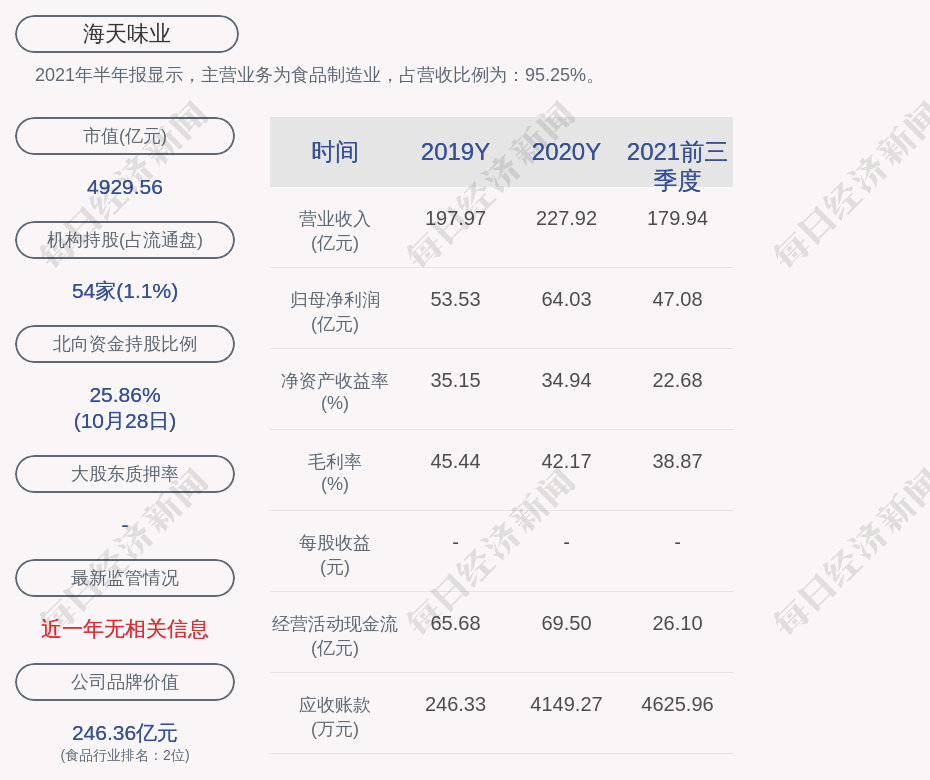2021年半年报显示,海天味业的主营业务为食品制造业,占营收比例为:95.25%。