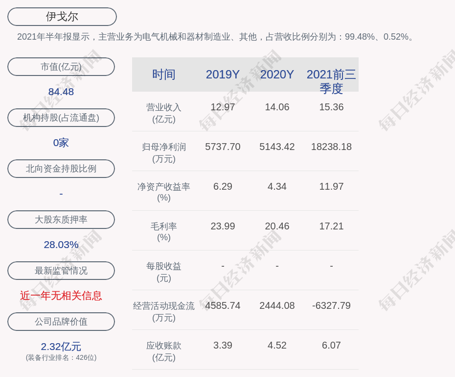 2021年半年报显示,伊戈尔的主营业务为电气机械和器材制造业、其他,占营收比例分别为:99.48%、0.52%。