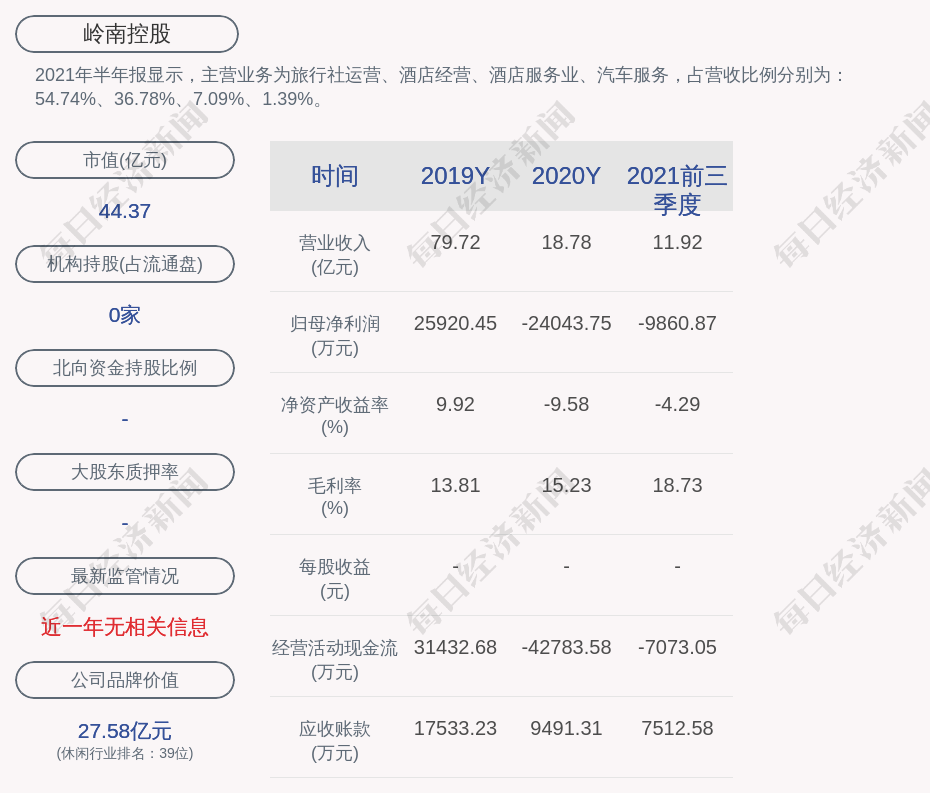 2021年半年报显示,岭南控股的主营业务为旅行社运营、酒店经营、酒店服务业、汽车服务,占营收比例分别为:54.74%、36.78%、7.09%、1.39%。