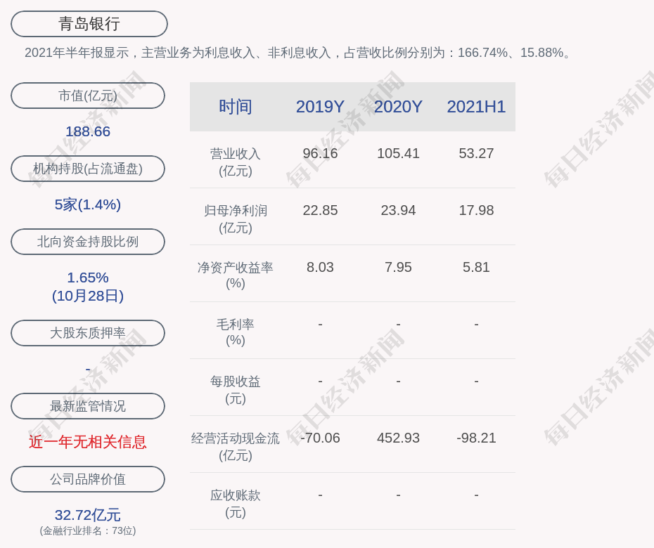 2021年半年报显示,青岛银行的主营业务为利息收入、非利息收入,占营收比例分别为:166.74%、15.88%。