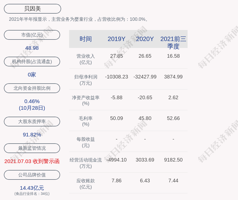 2021年半年报显示,贝因美的主营业务为婴童行业,占营收比例为:100.0%。