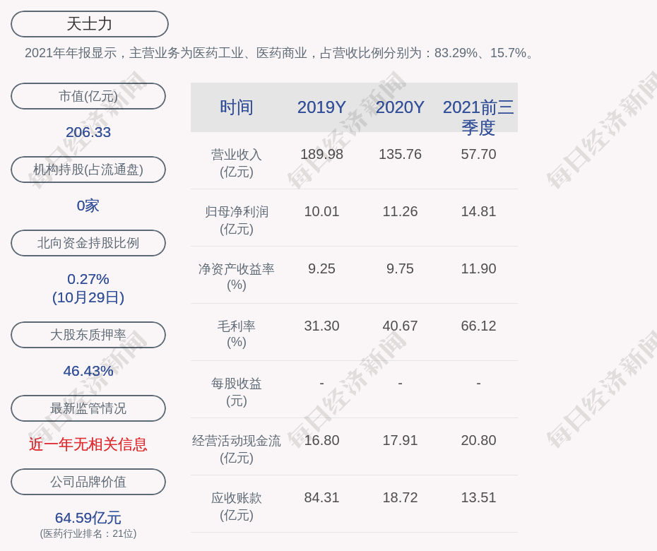 2021年年报显示,天士力的主营业务为医药工业、医药商业,占营收比例分别为:83.29%、15.7%。