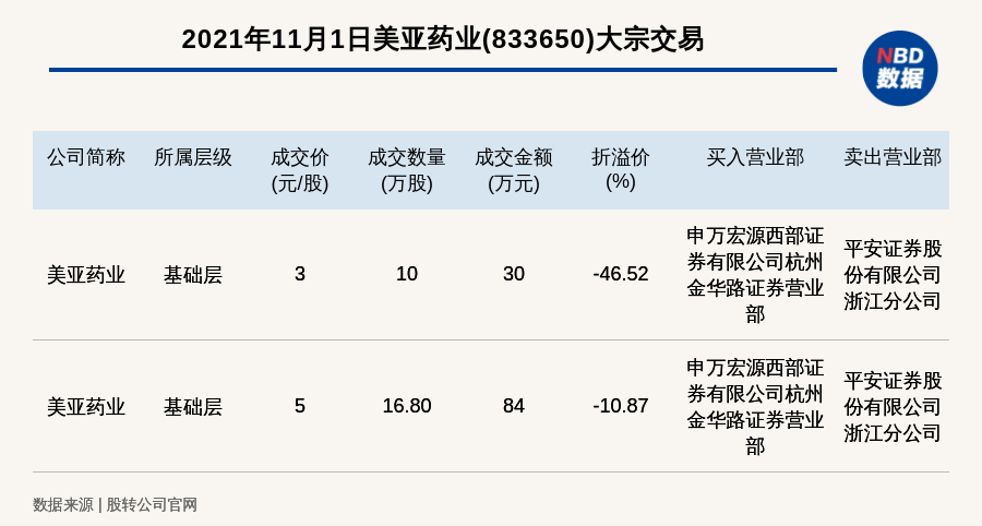 每经讯,2021年11月1日,新三板基础层公司美亚药业(833650)发生2笔大宗交易,折价率最高的一笔成交价3元/股,成交数量10万股,成交金额30万元,折价46.52%。买入营业部是申万宏源西部证券有限公司杭州金华路证券营业部,卖出营业部是平安证券股份有限公司浙江分公司。
