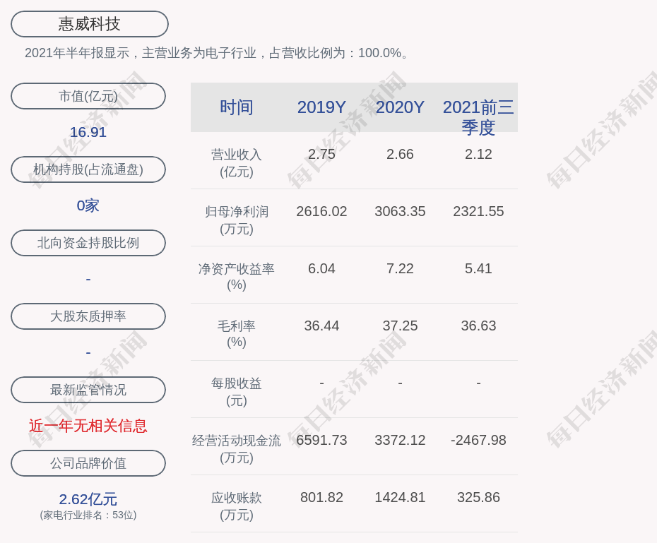 2021年半年报显示,惠威科技的主营业务为电子行业,占营收比例为:100.0%。