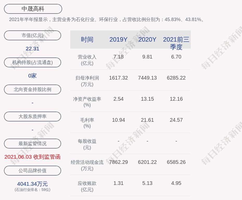 2021年半年报显示,中晟高科的主营业务为石化行业、环保行业,占营收比例分别为:45.83%、43.81%。