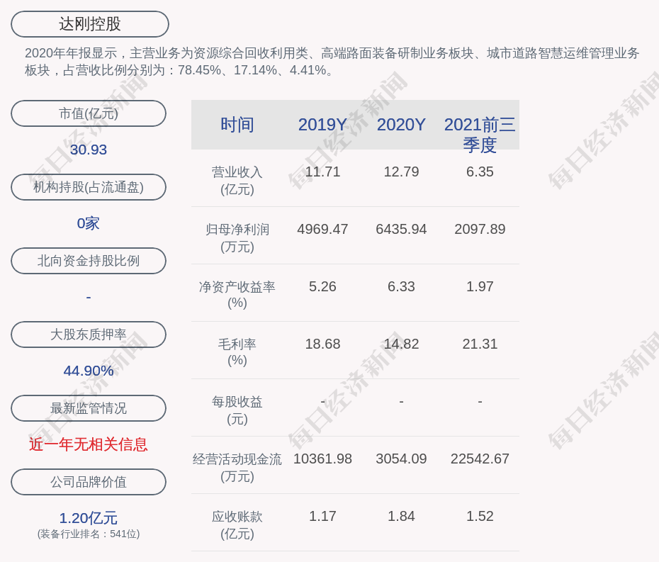 2020年年报显示,达刚控股的主营业务为资源综合回收利用类、高端路面装备研制业务板块、城市道路智慧运维管理业务板块,占营收比例分别为:78.45%、17.14%、4.41%。