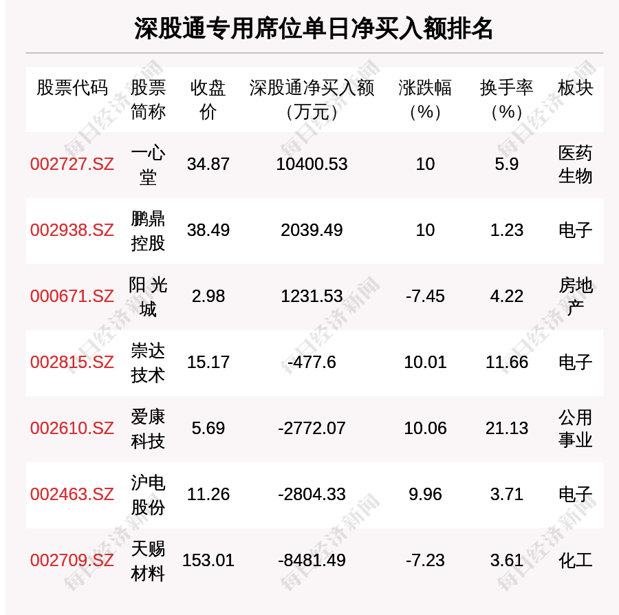 在龙虎榜中,涉及深股通专用席位的个股有7只,一心堂的深股通专用席位净买入额最大,净买入1.04亿元。