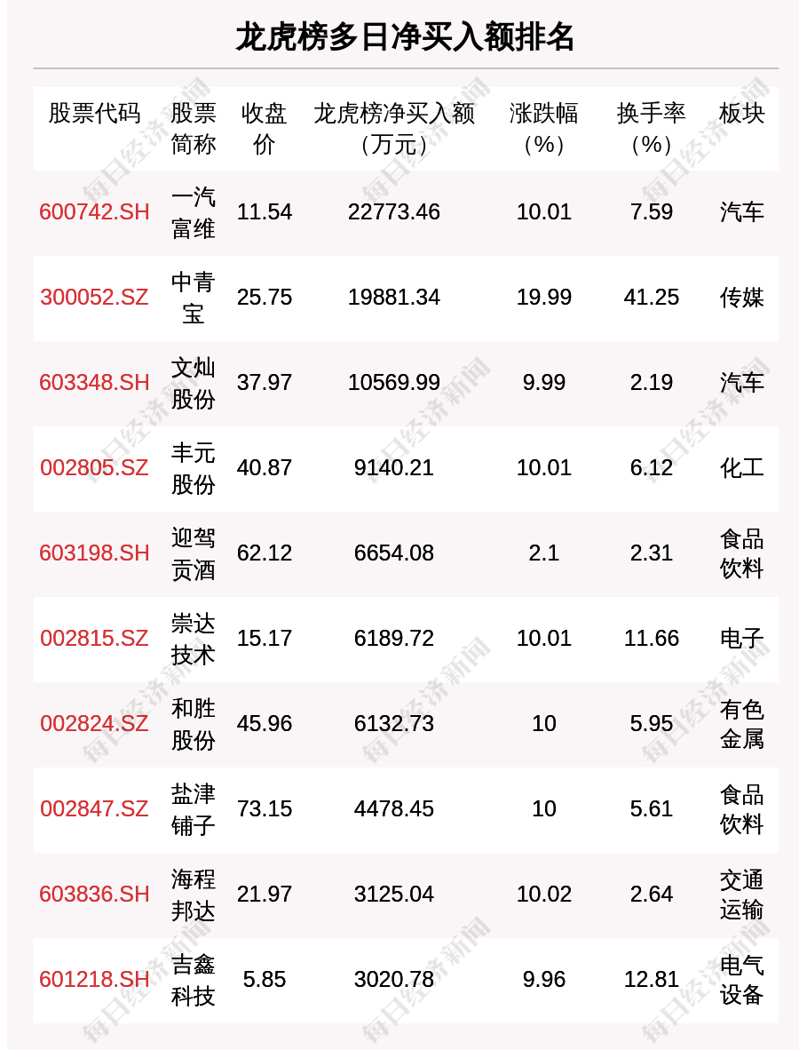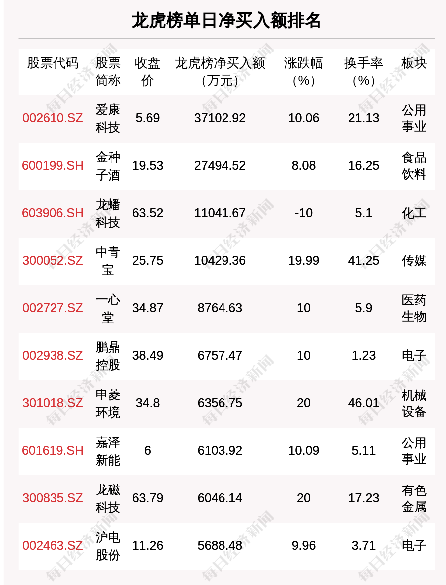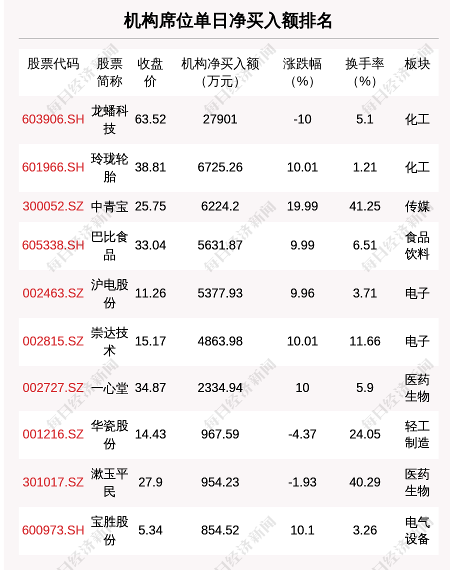 在龙虎榜中,涉及机构专用席位的个股有26只,净买入额前三的是龙蟠科技、玲珑轮胎、中青宝,分别为2.79亿元、6725.26万元、6224.2万元。