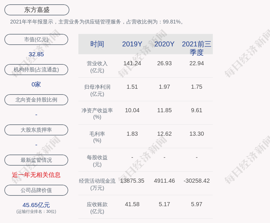 2021年半年报显示,东方嘉盛的主营业务为供应链管理服务,占营收比例为:99.81%。