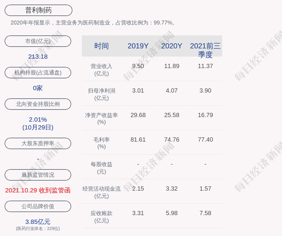2020年年报显示,普利制药的主营业务为医药制造业,占营收比例为:99.77%。