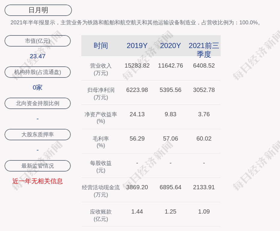 2021年半年报显示,日月明的主营业务为铁路和船舶和航空航天和其他运输设备制造业,占营收比例为:100.0%。
