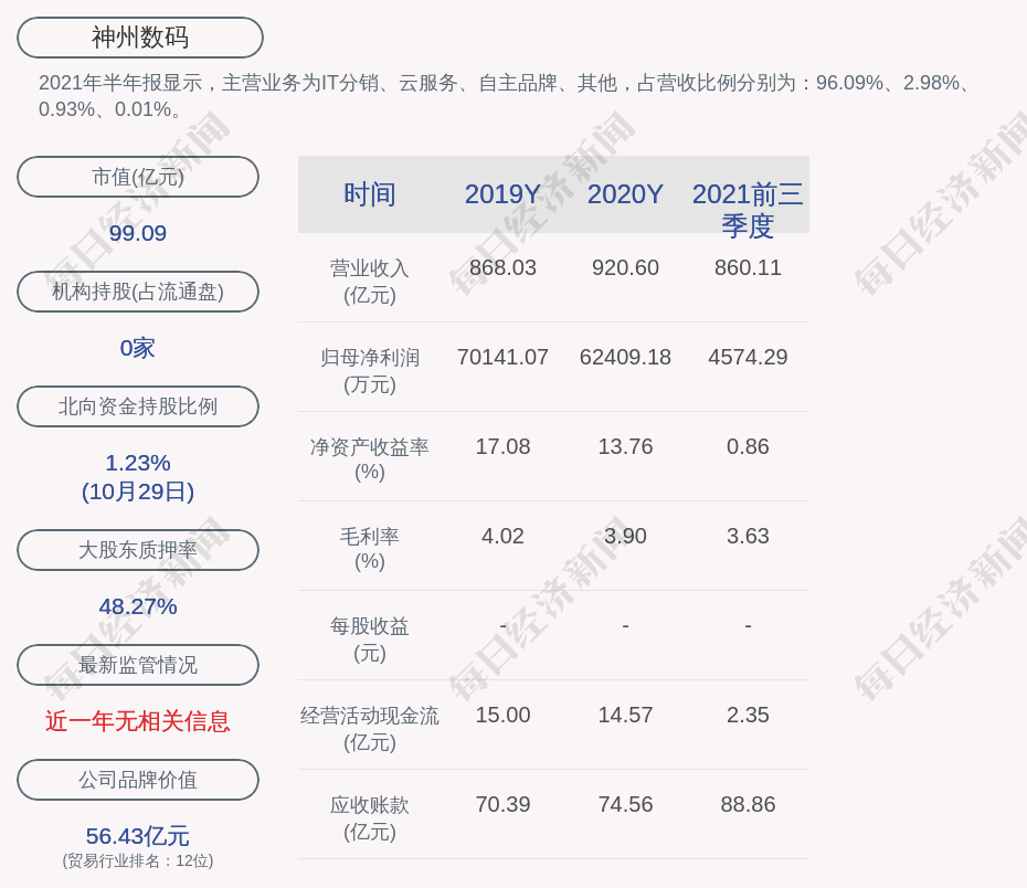 2021年半年报显示,神州数码的主营业务为IT分销、云服务、自主品牌、其他,占营收比例分别为:96.09%、2.98%、0.93%、0.01%。