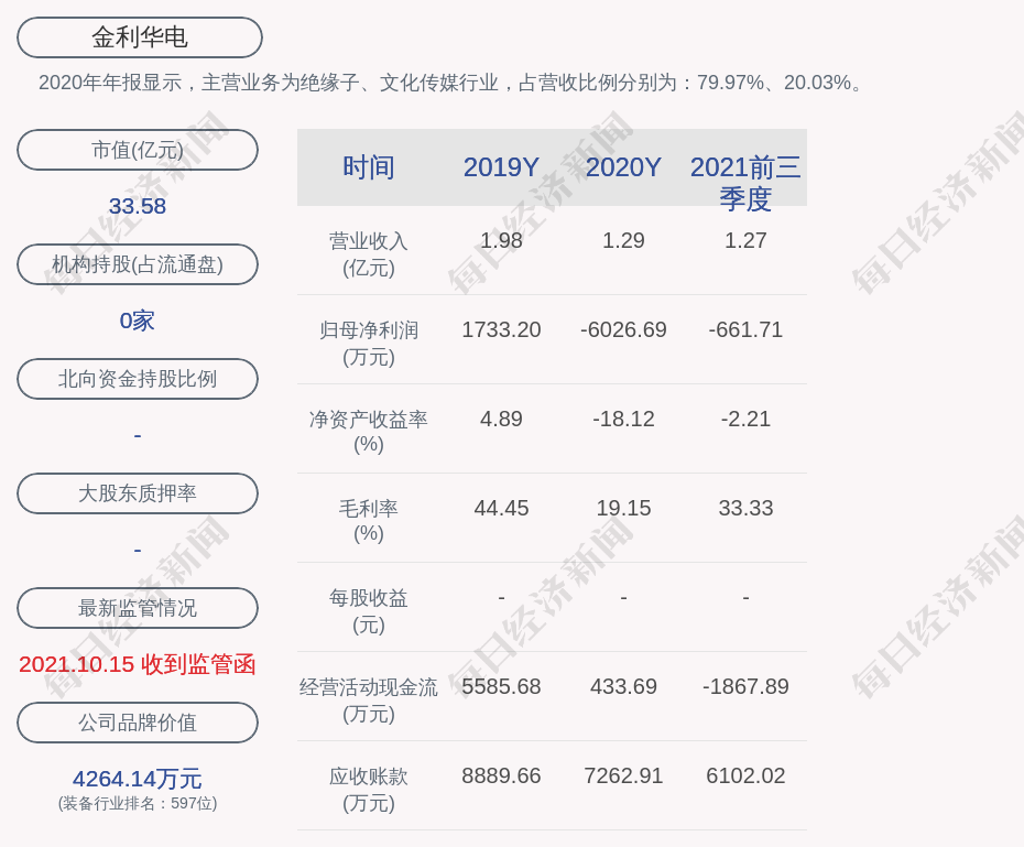 2020年年报显示,金利华电的主营业务为绝缘子、文化传媒行业,占营收比例分别为:79.97%、20.03%。