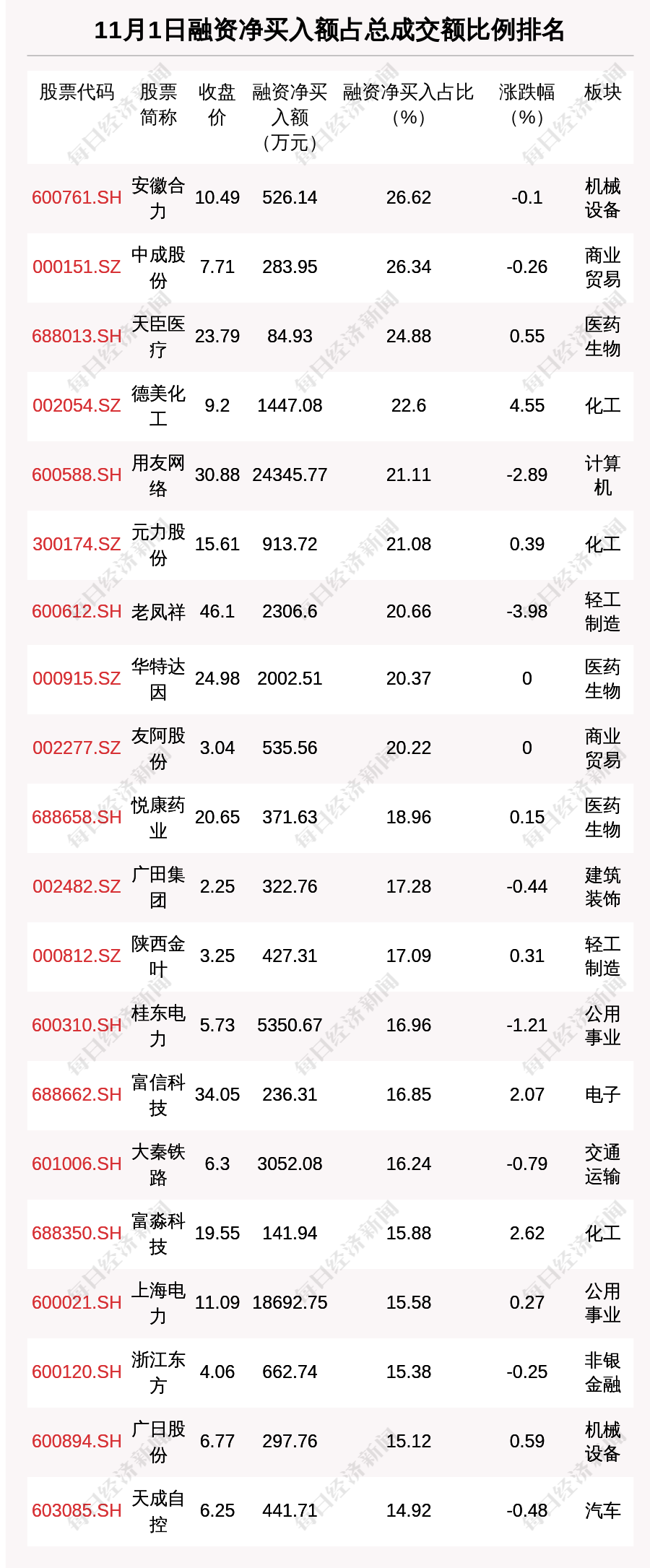 11月1日两市共有1049只个股有融资资金净买入。共有59只股票融资净买入额占总成交金额比例超10%,其中安徽合力、中成股份、天臣医疗排名前三,占比分别为26.62%、26.34%、24.88%。