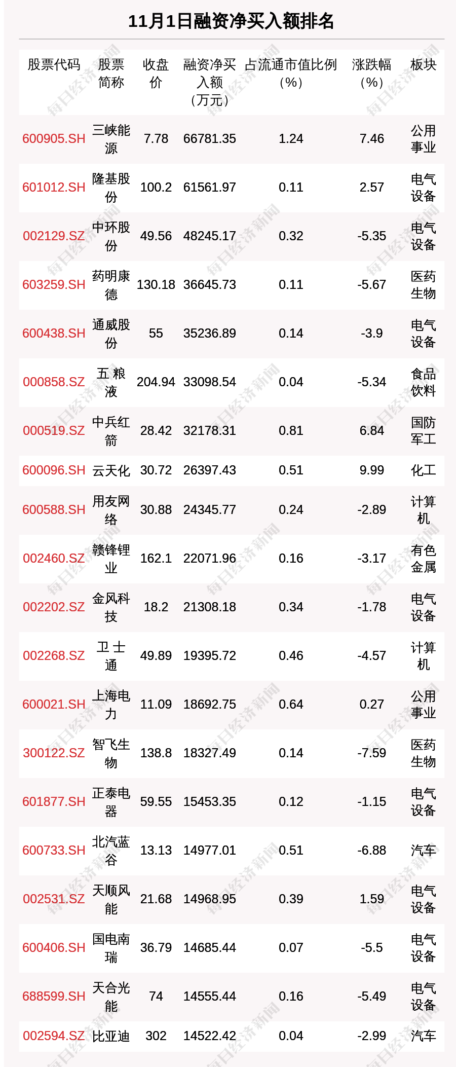 从融资资金净买入金额来看,共有31只个股净买入金额超亿元,其中三峡能源、隆基股份、中环股份排名前三,买入金额分别为6.68亿元、6.16亿元、4.82亿元。