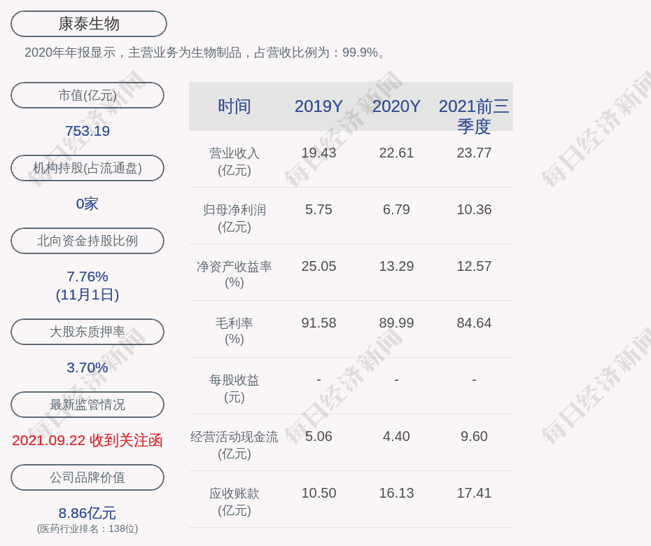 3. 康泰生物上次发布增持公告是2021年09月17日,第二个交易日下跌4.04%,康泰生物近一年共发布2次增持类公告。更多关键信息,请搜索“道达号”。