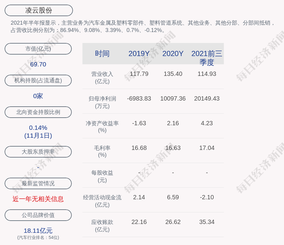 2021年半年报显示,凌云股份的主营业务为汽车金属及塑料零部件、塑料管道系统、其他业务、其他分部、分部间抵销,占营收比例分别为:86.94%、9.08%、3.39%、0.7%、-0.12%。