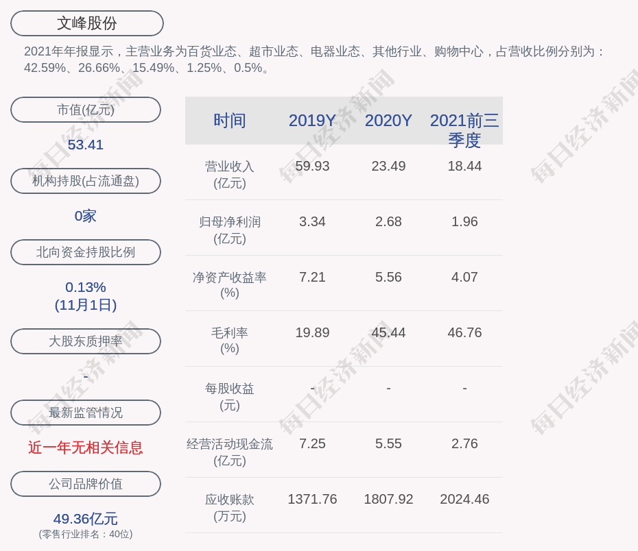 2021年年报显示,文峰股份的主营业务为百货业态、超市业态、电器业态、其他行业、购物中心,占营收比例分别为:42.59%、26.66%、15.49%、1.25%、0.5%。